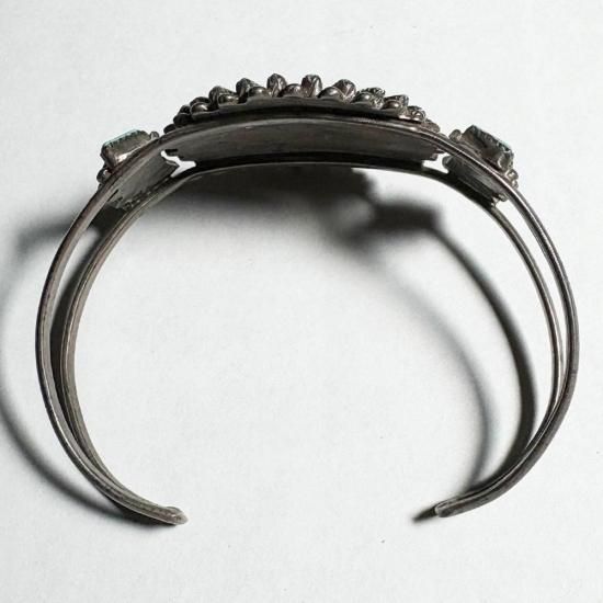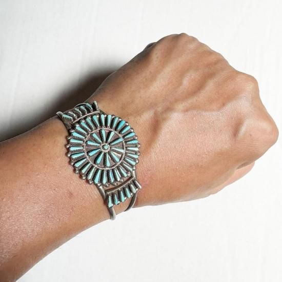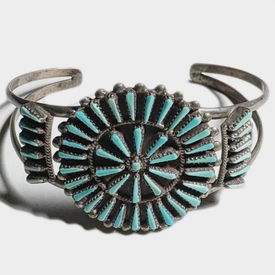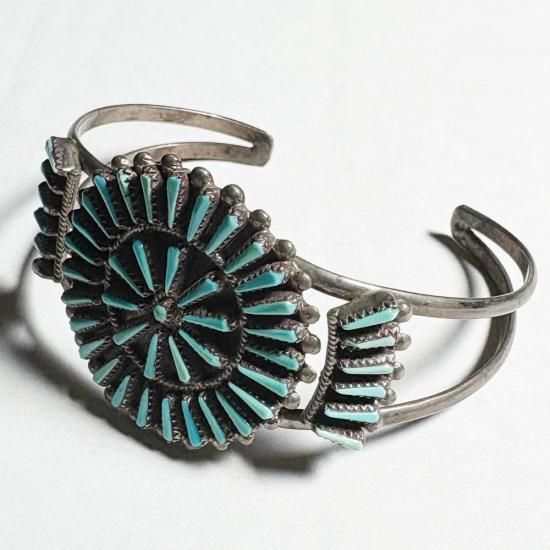 ズニ族特有の技法である、ニードルポイント製法で作られたバングルで、一つ一つ丁寧に繊細なターコイズを埋め込んだ手の込んだデザイン。