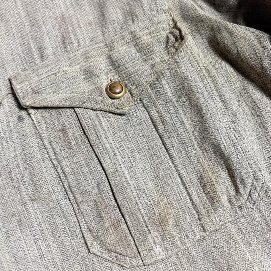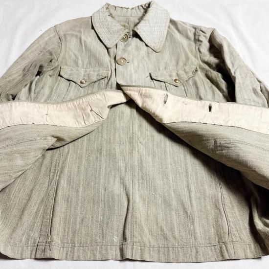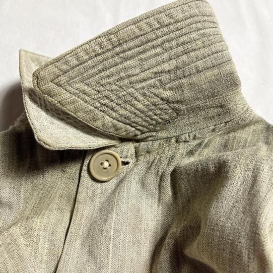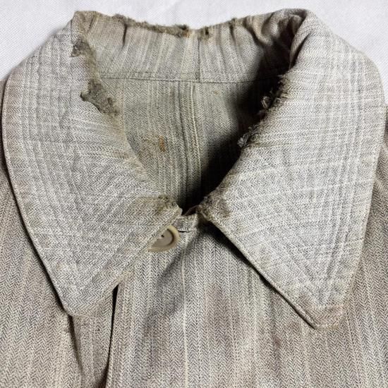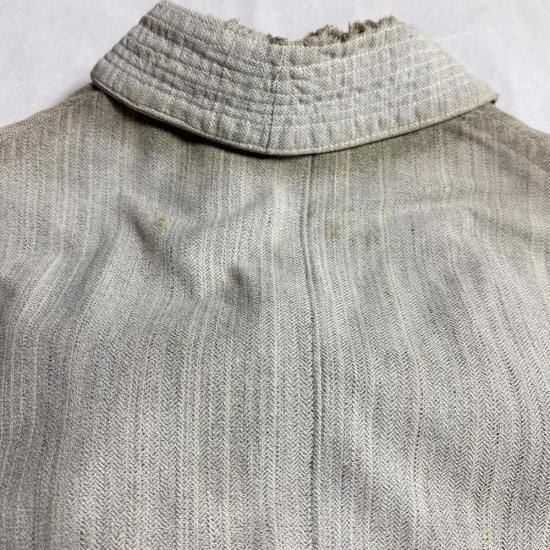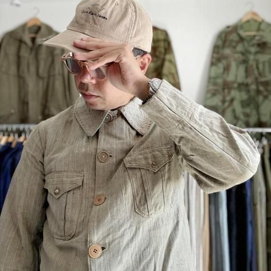 こちらは20年代~30年代当時の、フレンチワークアイテムでは非常に珍しい、ヘリンボーンツイルコットン素材を採用。しかもこちらは特にレアなヘリンボーンの編み地がランダムになっており、ストライプの様に見える特殊な素材感が圧巻です!