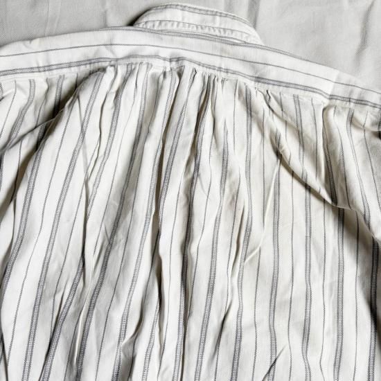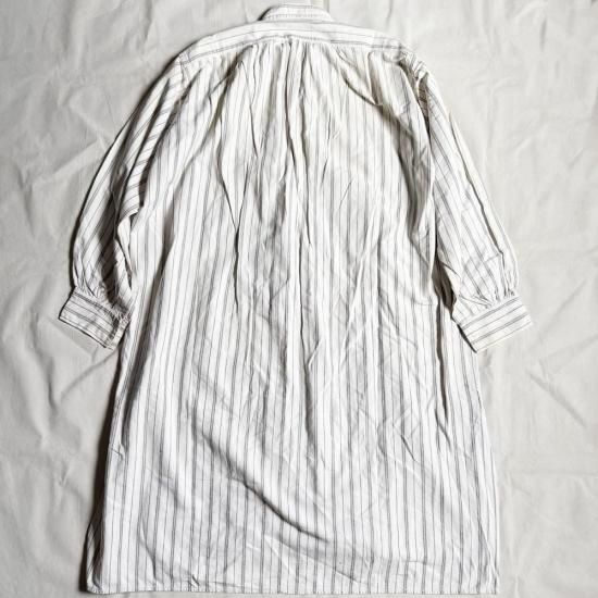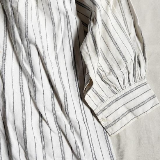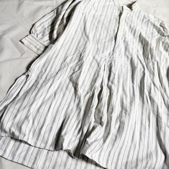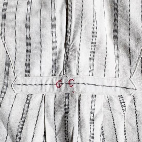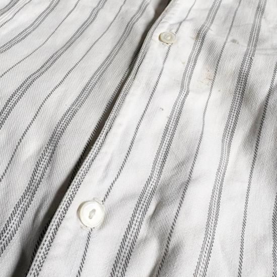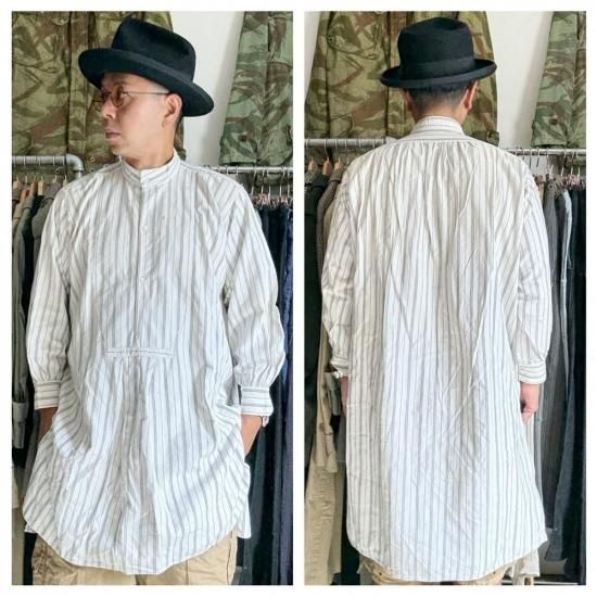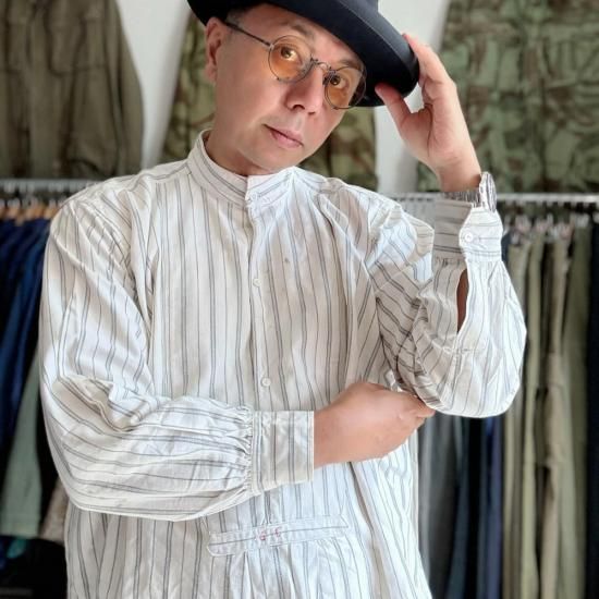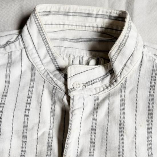 取り入れやすいホワイトベースのストライプコットンスタンドカラーシャツ!推定30年代〜40年代頃の物と思われる、フレンチストライプスタンドカラーグランパシャツが入荷。