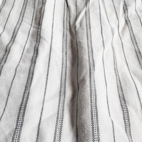 こちらはホワイトベースにグレーのストライプ柄のコットン素材を採用しております。厚すぎず、薄手すぎない、通年使用可能な中肉厚のコットン素材となっております。