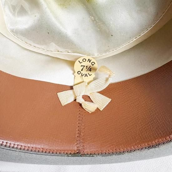 サイズタグが7 1/4の7表記ありイエロータグ、レザースベリとライナーのロゴ刻印内がリーフタイプで、ライナーに透明のポマードガードが付く等のディテールより、約50年代後期〜60年代初期頃の物と推測できます。