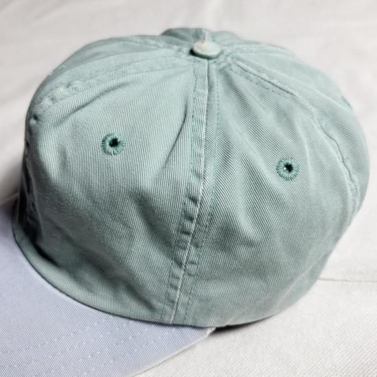 程よく経年変化した、絶妙なフェード感のあるライトグリーンカラーボディに、ブリム部分がライトブルーの配色になった珍しいデザイン。フロントとバックにネイビーカラーの刺繍デザインが入ります!