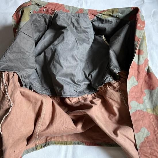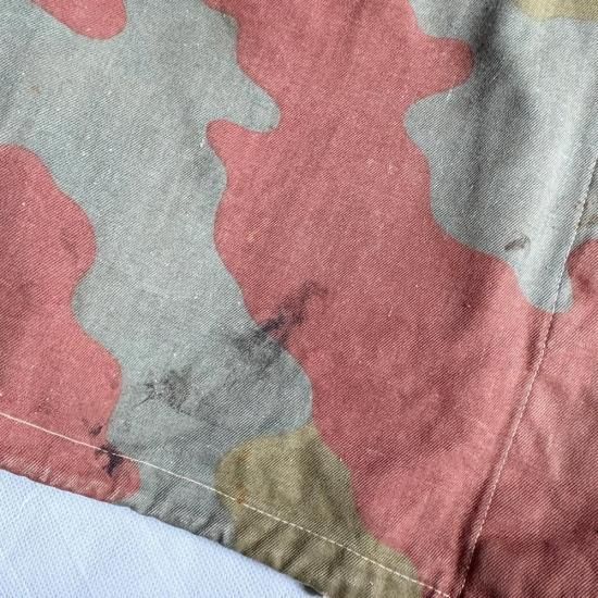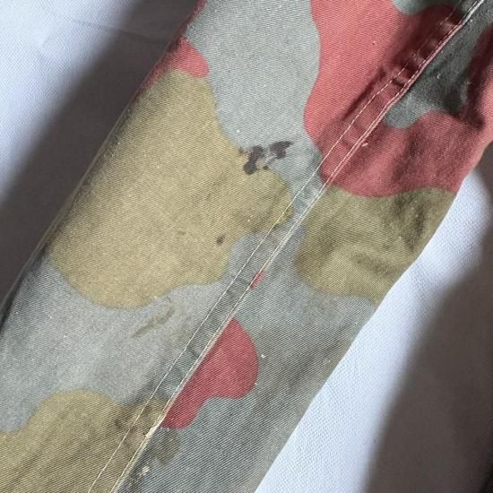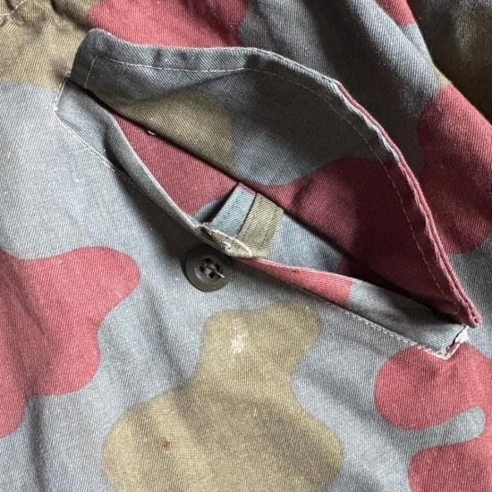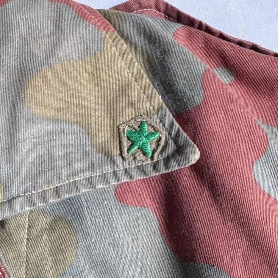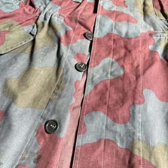 陸軍のカモ柄とパターンは同じですが、海軍仕様タイプは、やや青みがかったグレー系の背景に、赤褐色と黄土色カモフラージュ柄が特徴。こちらのジャケットは中肉厚のコットンツイル素材を採用しております。
