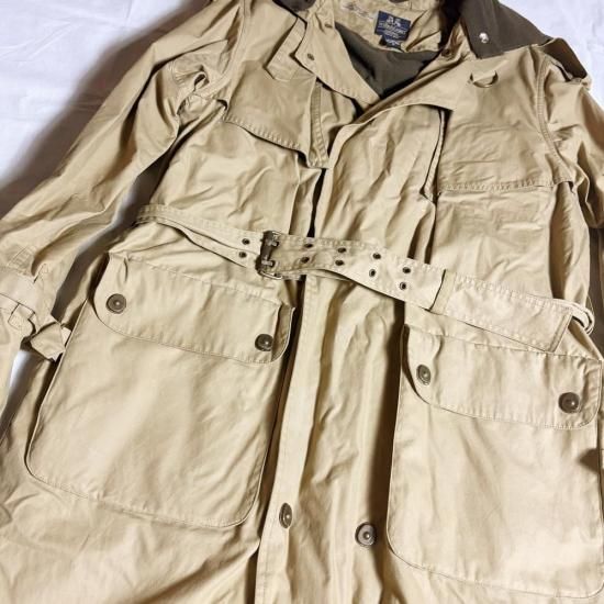 スナップボタンのダブルブレステッド仕様で、乗馬用のコートとトレンチコートのディテールが見事にミックスされた、非常凝った作りの一品。